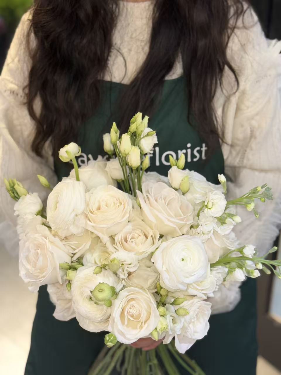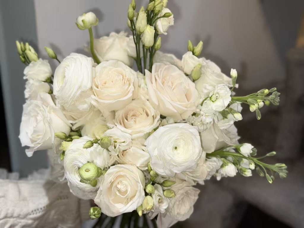 This hand-tied bridal bouquet features a refined mix of roses, ranunculus, lisianthus, and stock, complemented with delicate seasonal blooms for a soft and elegant look. The all-white palette creates a timeless and graceful design, perfect for a classic wedding style. Due to seasonal availability, some flowers may be substituted with similar blooms of equal or greater value while maintaining the overall style and color palette.