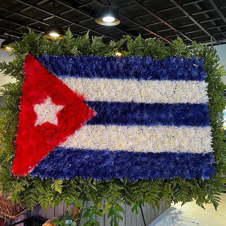 his custom standing spray is designed in the shape of a flag using red, white, and blue chrysanthemums accented with lush greenery. The bold and meaningful design creates a heartfelt tribute to honor and remember a loved one.