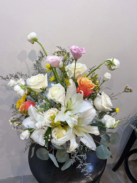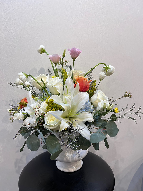 This elegant arrangement features white lilies, white roses, ranunculus, lisianthus, and a touch of orange rose, accented with delicate filler flowers and eucalyptus greenery. The soft white tones with hints of warm color create a fresh and graceful design.
