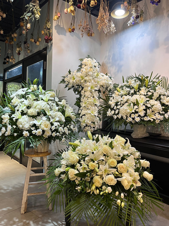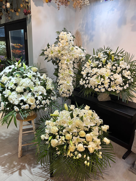 The arrangements feature white lilies, white roses, carnations, daisies, and seasonal white flowers accented with lush greenery, creating a graceful and peaceful tribute.