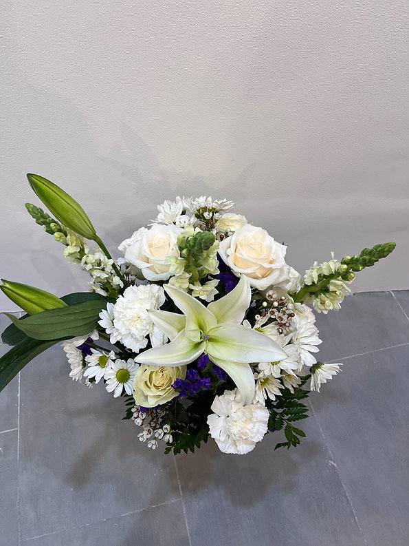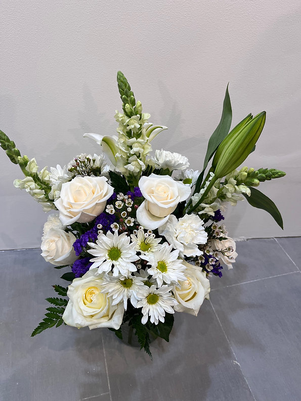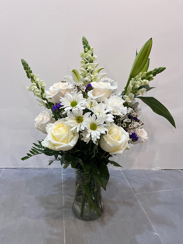 This elegant vase arrangement features white lilies, roses, carnations, daisy mums, snapdragons, and wax flower, accented with seasonal greenery for a soft and classic look. The clean white tones with subtle purple accents create a graceful and timeless design suitable for many occasions.
