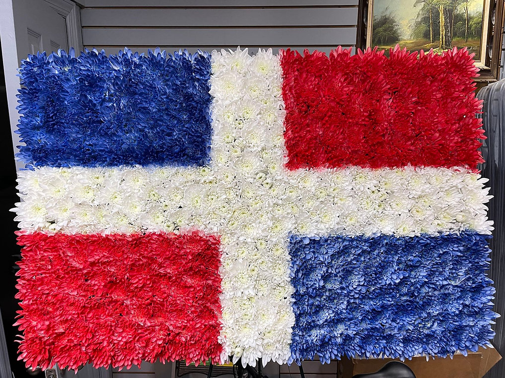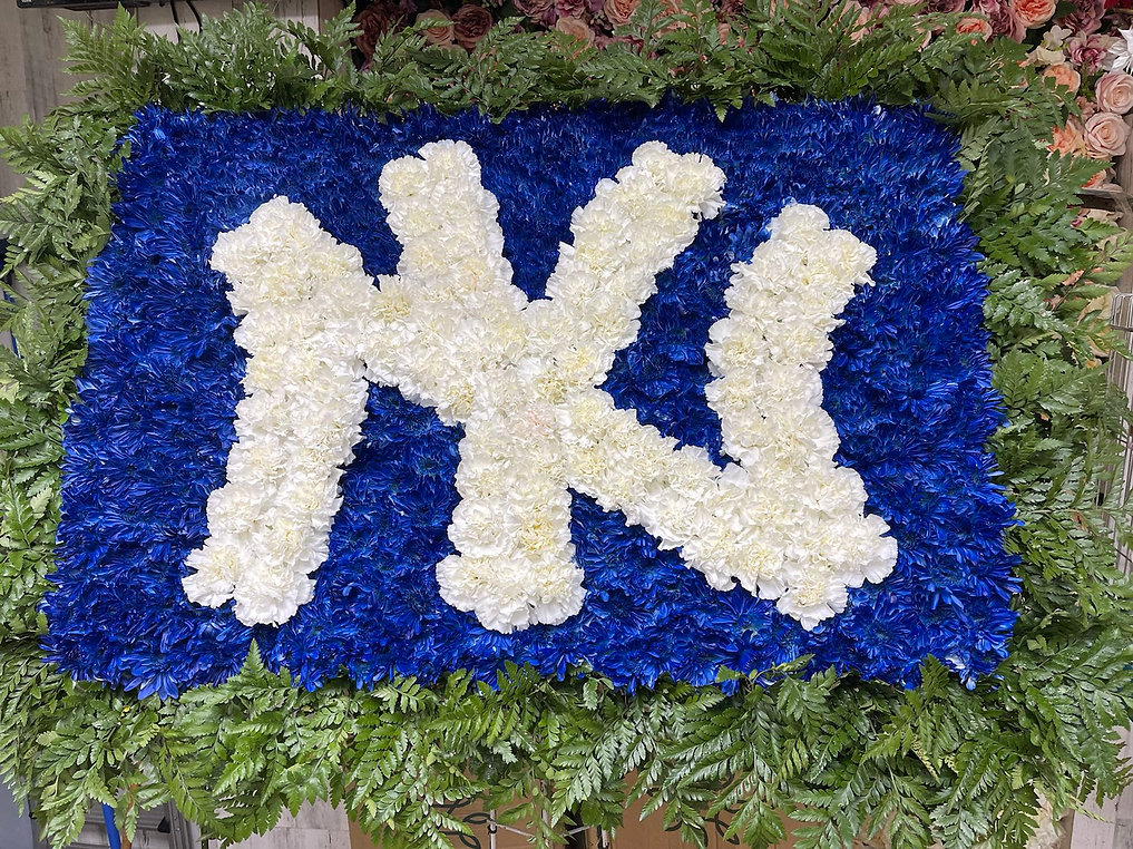This unique standing spray is designed in the shape of a flag using white and blue chrysanthemums, accented with a sunflower and lush greenery. The bold design creates a meaningful and heartfelt tribute to honor and remember a loved one.