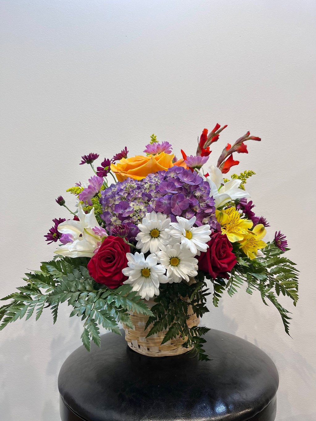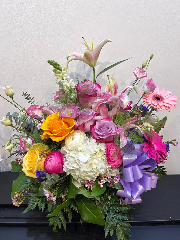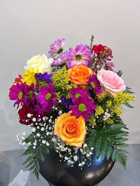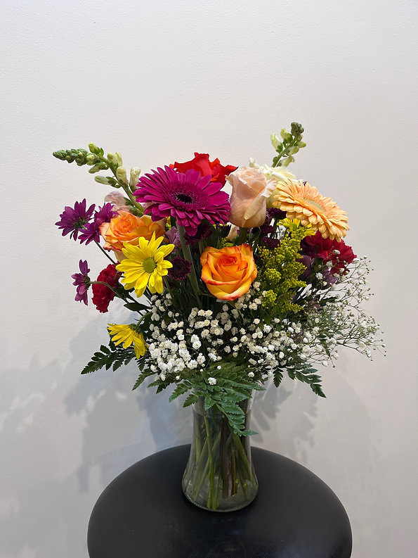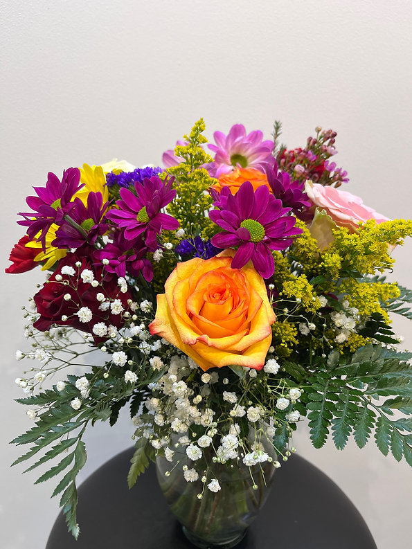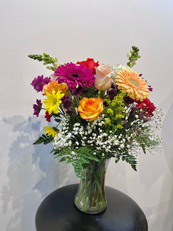 This vibrant vase arrangement features a cheerful mix of roses, gerbera daisies, spray roses, daisy mums, baby’s breath, solidago, and seasonal greenery. The lively combination of bright pink, yellow, peach, and purple blooms creates a playful, garden-inspired look full of color and texture.