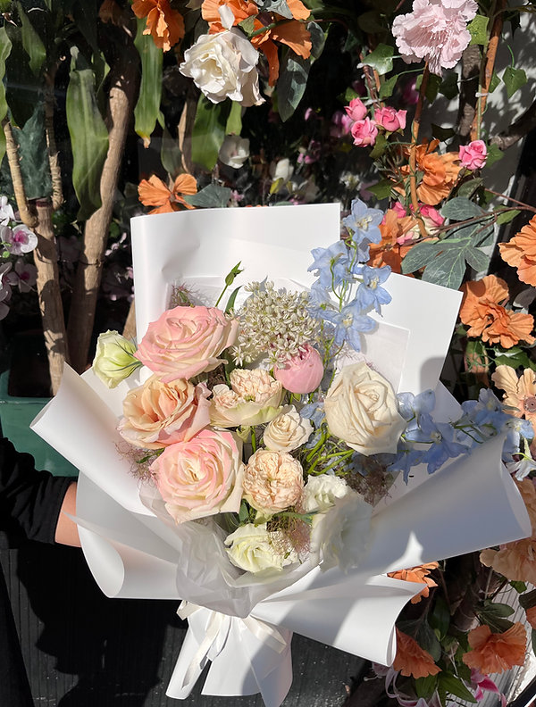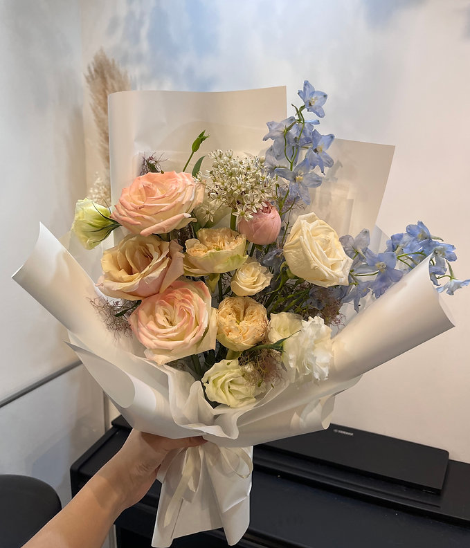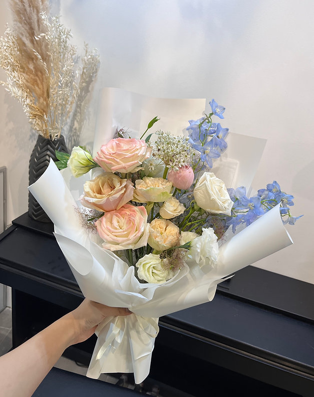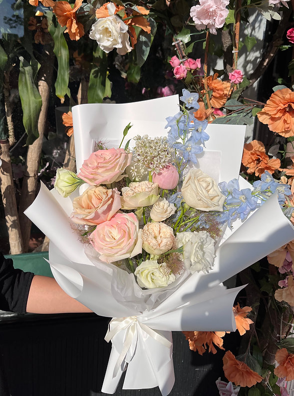 This soft and elegant hand-tied bouquet features a delicate mix of roses, spray roses, lisianthus, delphinium, Queen Anne’s lace, and seasonal greenery. Designed in gentle peach, cream, and soft blue tones, the bouquet creates a light and romantic garden-inspired style.