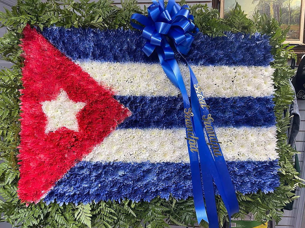 This standing wreath features red, white, and blue chrysanthemums accented with lush greenery. The patriotic color palette creates a meaningful and respectful tribute to honor and remember a loved one.