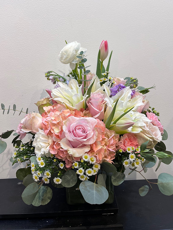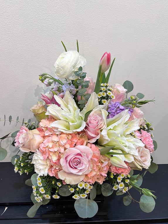 This soft and elegant arrangement features pink roses, hydrangea, white lilies, ranunculus, tulips, stock, and delicate chamomile daisies, complemented with eucalyptus and seasonal greenery. The combination of blush pink, peach, and creamy white tones creates a gentle and romantic look.